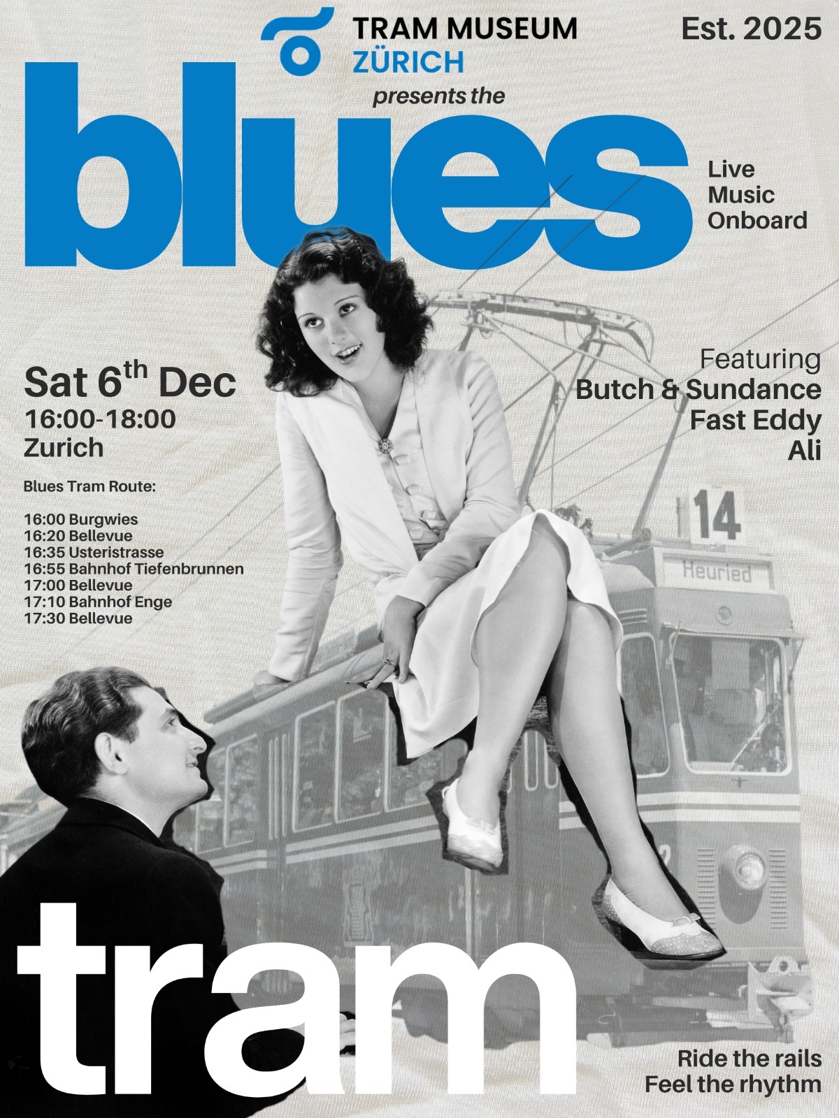 Das Blues-Tram ist in der Zürcher Innenstadt unterwegs: Dafür wie geschaffen ist der Motorwagen 1392 mit Baujahr 1949, auch bekannt als «Kurbeli». Live im Tram sind Butch&Sundance, Fast Eddy und Ali zu hören.